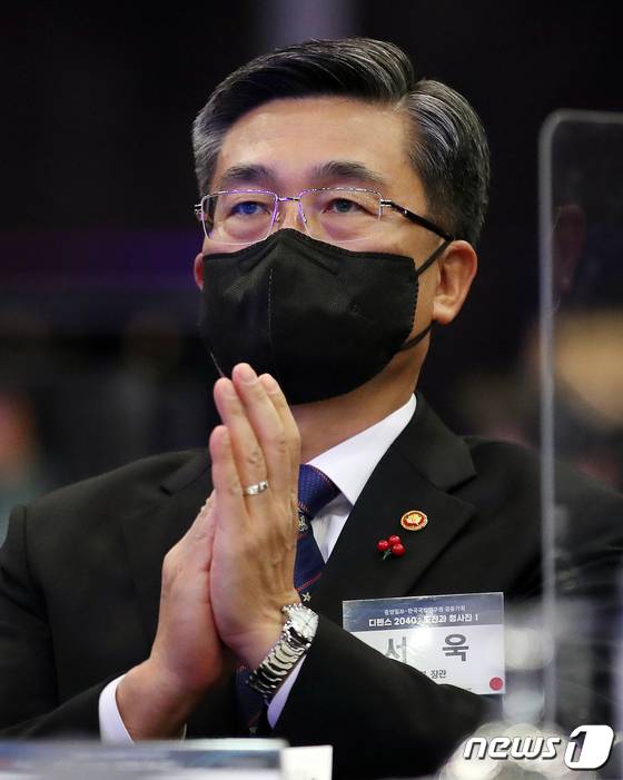 (서울=뉴스1) 김진환 기자 = 서욱 국방장관이 12일 오전 서울 중구 웨스틴 조선호텔에서 열린 디펜스 2040 컨퍼런스에서 박수를 치고 있다. 2022.1.12/뉴스1