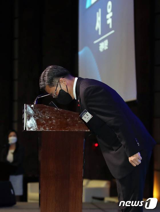 (서울=뉴스1) 김진환 기자 = 서욱 국방장관이 12일 오전 서울 중구 웨스틴 조선호텔에서 열린 디펜스 2040 컨퍼런스에서 축사 전 인사를 하고 있다. 2022.1.12/뉴스1