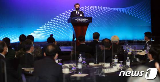 (서울=뉴스1) 김진환 기자 = 서욱 국방장관이 12일 오전 서울 중구 웨스틴 조선호텔에서 열린 디펜스 2040 컨퍼런스에서 축사를 하고 있다. 2022.1.12/뉴스1