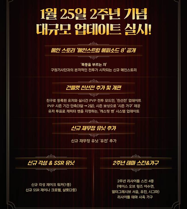 건틀렛 시즌 개편 계획도 공개됐다. 더욱 빠른 보상 획득과 로테이션을 위해 시즌 간격을 2개월로 줄인다. 시즌 완료때마다 특정 티어 이상은 엠블럼과 함께 기념 가구 보상으로 명예를 쌓을 수 있다. 1월은 프리 시즌으로 진행하고 2주년 업데이트 이후 정규 시즌을 시작한다. 방어, 치명, 명중, 회피 능력치의 건틀렛 제한 보정을 제거한다. 협력사 등록 인원에게 친선전을 요청해 건틀렛 대전이 가능해지고 향후 협력사 외 컨소시엄 멤버나 특정 상대에게 요청하는 기능까지 확장해 나갈 계획이다.