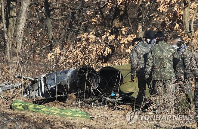 (화성=연합뉴스) 홍기원 기자 = 전날 공군 F-5E 전투기 한 대가 추락해 조종사가 순직한 경기도 화성시의 한 야산에서 12일 오전 군 관계자들이 추락 동체 등 현장을 살펴보고 있다. 2022.1.12