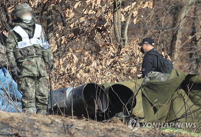 (화성=연합뉴스) 홍기원 기자 = 전날 공군 F-5E 전투기 한 대가 추락해 조종사가 순직한 경기도 화성시의 한 야산에서 12일 오전 군 관계자들이 추락 동체 등 현장을 살펴보고 있다. 2022.1.12