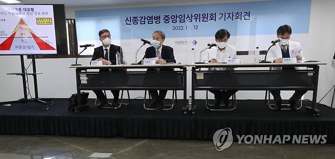 (서울=연합뉴스) 안정원 기자 = 정부 치료자문기구인 신종감염병 중앙임상위원회가 12일 서울 중구 을지로 중앙예방접종센터에서 기자회견을 하고 있다. 왼쪽부터 이진용 건강보험심사평가원 심사평가연구소장, 오명돈 신종감염병 중앙임상위원장, 정기현 국립중앙의료원장, 전재현 국립중앙의료원 전문의. 2022.1.12 [공동취재]