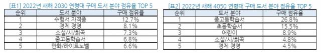 4050 연령대에서는 초중고 학습서 구매 동향이 눈에 띄었다. 중고등 학습서가 26.8%로 가장 많았으며 이어 초등 학습서(15.5%), 어린이(8.9%), 소설·시·희곡(4.8%) 등의 순이었다.