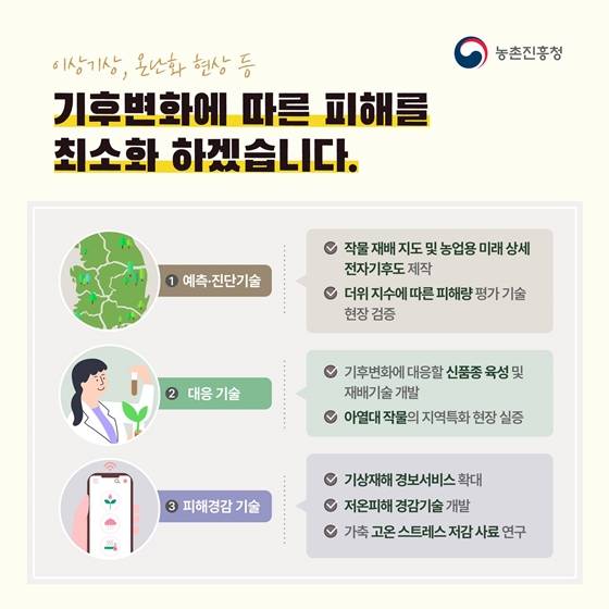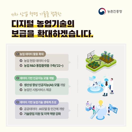 ◆ 4차산업혁명 기술을 접목한 디지털 농업기술의 보급을 확대하겠습니다 [1] 농업 데이터 활용 확대 - 농업 현장 데이터 수집 - 농업 R&D 통합플랫폼 구축('22~) [2] 데이터 기반 인공지능 모델 개발 - 생산성 향상 인공지능(AI) 모델 개발 - 농업인 시범서비스 제공 [3] 데이터 기반 농업기술 생태계 조성 - 공공데이터·AI모델 등 민간에 개방 - 기술창업 지원 및 지역 역량 강화 ◆ 농산물의 생산성과 품질 향상에 탁월한 노지 디지털농업 보급에 속도를 내겠습니다 [1] 식량 - 벼는 자동화로 노동력 절감 * 사용자 맞춤형 스마트 물관리, 영농의사결정 서비스 - 밀·콩은 지능화로 생산성 향상 * (밀) 디지털농업 기술 패키지화, (콩) 정밀 물관리 기술 [2] 원예 - 노지채소 품질향상 기술 보급 * (배추) 드론 활용 영상 기반의 병해충 방제기술 개발 [3] 축산 - 가축 정밀사양 기술로 생산성 향상 및 질병 예방 - 국산 착유로봇 고도화 ◆ 농업분야 탄소중립 실행을 위해 저탄소 농업기술을 개발하겠습니다 [1] 농축산 온실가스 인벤토리 구축 온실가스 배출계수 개발, 배출 통계 고도화 [2] 탄소 저감기술 개발 벼 재배 논물관리, 저메탄사료 개발 등 탄소배출 저감기술 개발 [3] 신재생에너지 생산 - 농업부산물 활용 - 신재생에너지 생산기술 개발 ※ 배출량 국가보고서 발간('22), 토양탄소 축적변화 등 배출계수 개발 ◆ 이상기상, 온난화 현상 등 기후변화에 따른 피해를 최소화하겠습니다 [1] 예측·진단 기술 - 작물 재배 지도 및 농업용 미래 상세 전자기후도 제작 - 더위 지수에 따른 피해량 평가 기술 현장 검증 [2] 대응 기술 - 기후변화에 대응할 신품종 육성 및 재배기술 개발 - 아열대 작물의 지역특화 현장 실증 [3] 피해경감 기술 - 기상재해 경보서비스 확대 - 저온피해 경감기술 개발 - 가축 고온 스트레스 저감 사료 연구 농촌진흥청의 2022년은 농업인의 즐거운 삶, 국민의 행복을 고민하는 시간으로 채워가겠습니다.
