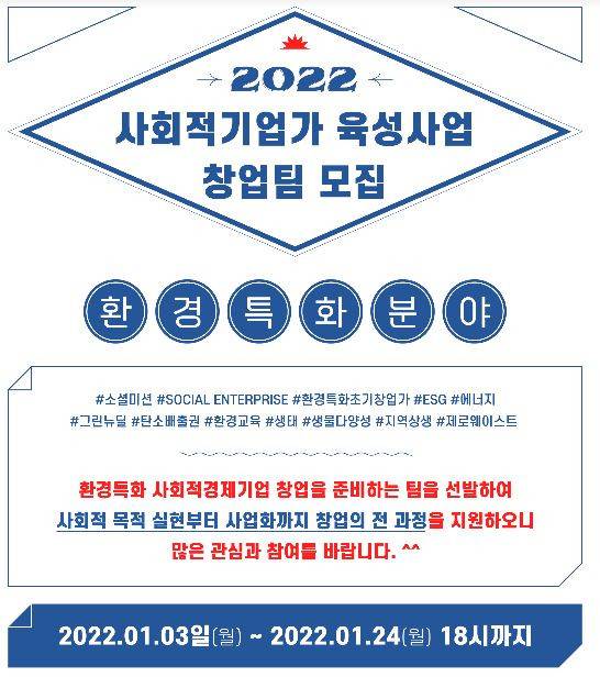 터치포굿은 2022년에도 환경 분야 사회적기업가 육성사업을 이어간다. 터치포굿과 한국자원순환사회적협동조합, 한국환경산업협회이 주관하고 고용노동부와 한국사회적기업진흥원의 지원으로 이뤄지는 ‘2022 사회적기업가 육성사업’ 모집은 1월 24일까지다. 온라인 사업설명회는 1월 13일 오전 10시에 진행되며 팀별 미팅은 1월 13일 오후 1시부터 진행할 예정이다. 설명회에서는 참여기관과 신청 방법에 대해 소개하고 질의응답의 시간을 가진다. 팀별 미팅 시간에는 초기창업팀으로부터 사전 질문을 접수해 창업지원기관 담당자와의 상담을 진행할 예정이다.