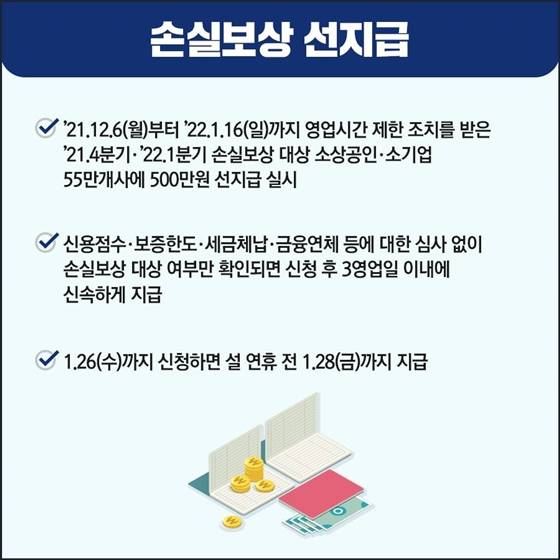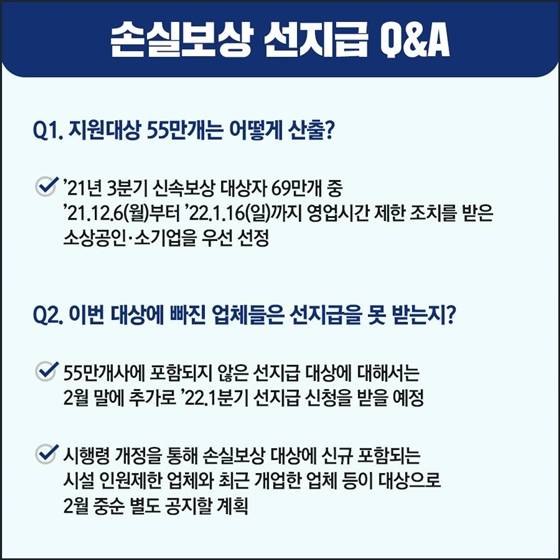 - ’21.12.6(월)~’22.1.16(일)까지 영업시간 제한 조치를 받은 ’21년 4분기·’22년 1분기 손실보상 대상 소상공인·소기업 55만개사에 500만원 선지급 실시