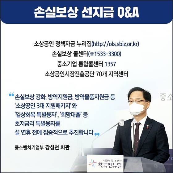 “거리두기 강화 등 코로나19 장기화로 심화되고 있는 소상공인의 어려움을 조금이라도 빨리 덜어드리기 위해 손실보상 선지급을 비롯한 중층적 지원대책을 이행하고 있습니다. 설 연휴 전에 최대한 신속하게 집행하는데 만전을 기하겠습니다.”