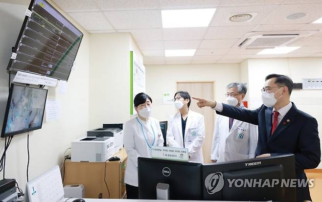 (서울=연합뉴스) 정종철 교육부 차관(오른쪽)이 12일 충북대병원을 방문해 코로나19 추가병상 확보 진행 상황을 점검하고 있다. 2022.1.12