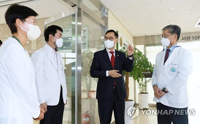 (서울=연합뉴스) 정종철 교육부 차관(오른쪽 두 번째)이 12일 코로나19 추가병상 확보 진행상황 점검차 충북대병원을 방문해 최영석 병원장 등 관계자들과 대화하고 있다. 2022.1.12