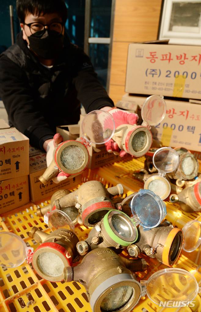 [전주=뉴시스] 김얼 기자 = 연일 강추위가 기승을 부리고 있는 12일 전북 전주시 맑은물사업본부에서 관계자가 동파된 수도계량기를 정리하고 있다. 2022.01.12. pmkeul@nwsis.com