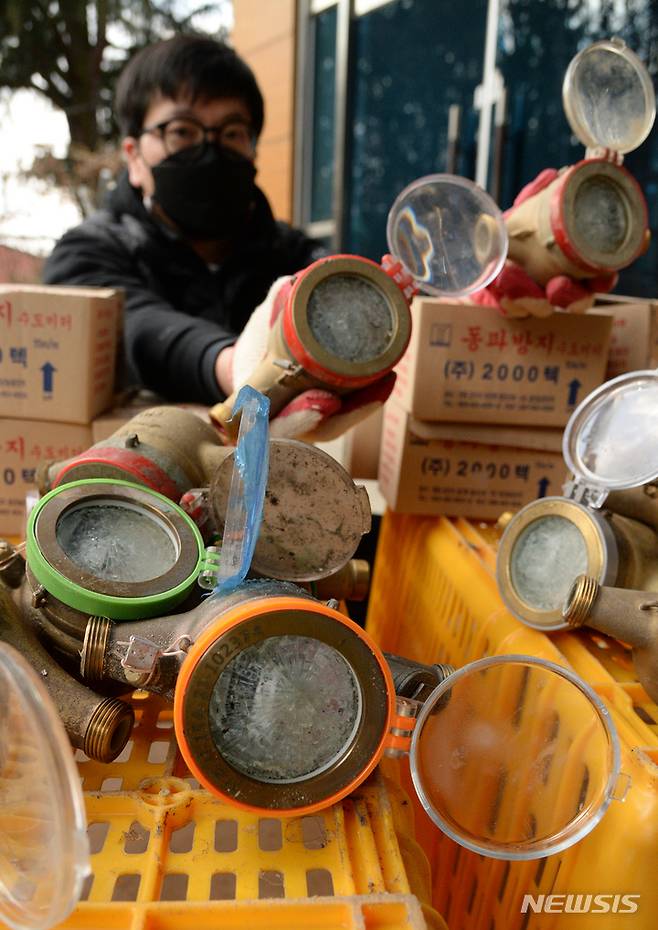 [전주=뉴시스] 김얼 기자 = 연일 강추위가 기승을 부리고 있는 12일 전북 전주시 맑은물사업본부에서 관계자가 동파된 수도계량기를 정리하고 있다. 2022.01.12. pmkeul@nwsis.com