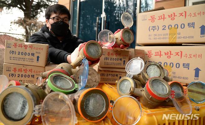 [전주=뉴시스] 김얼 기자 = 연일 강추위가 기승을 부리고 있는 12일 전북 전주시 맑은물사업본부에서 관계자가 동파된 수도계량기를 정리하고 있다. 2022.01.12. pmkeul@nwsis.com