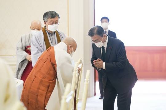 문 대통령은 "종단마다 그동안 정부의 방역조치에 적극 협조하여 법회, 예배, 미사 같은 신앙 활동을 자제해 주셨고, 심지어 부처님 오신 날 경축법회와 연등회 같은 가장 중요한 종교 행사까지 방역을 위해 연기하거나 취소하는 솔선수범을 보여주셨다"며 "그 같은 협조 덕분에 이번의 4차 유행에서는 종교시설 관련 감염이 크게 줄어들었다"고 감사의 뜻을 전했다.