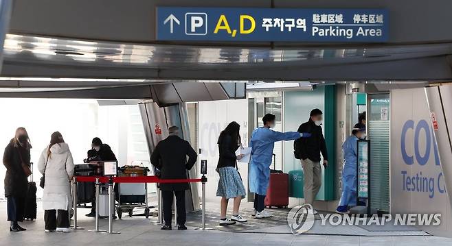 (영종도=연합뉴스) 임헌정 기자 = 신종 코로나바이러스 감염증(코로나19) 해외 유입 신규 확진자가 381명으로 집계 이래 가장 많은 수치를 기록한 12일 영종도 인천국제공항 제1여객터미널 코로나19 검사센터에서 시민들이 검사를 기다리고 있다. 2022.1.12