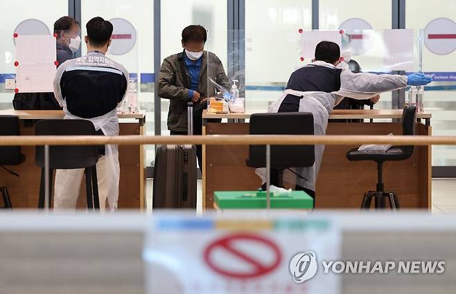 (영종도=연합뉴스) 임헌정 기자 = 신종 코로나바이러스 감염증(코로나19) 해외 유입 신규 확진자가 381명으로 집계 이래 가장 많은 수치를 기록한 12일 영종도 인천국제공항 제1여객터미널 입국장에서 해외 입국자들이 이동하고 있다. 2022.1.12