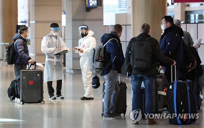 (영종도=연합뉴스) 임헌정 기자 = 신종 코로나바이러스 감염증(코로나19) 해외 유입 신규 확진자가 381명으로 집계 이래 가장 많은 수치를 기록한 12일 영종도 인천국제공항 제1여객터미널 입국장에서 해외 입국자들이 이동하고 있다. 2022.1.12