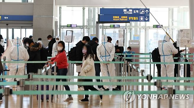 (영종도=연합뉴스) 임헌정 기자 = 12일 영종도 인천국제공항 제1여객터미널 출국장에서 중국행 항공편 탑승객들이 탑승 수속을 하고 있다. 2022.1.12