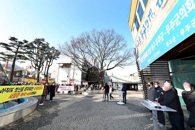 결의대회를 마친 주민들은 군청 앞에서 출발해 용천약국 사거리~풀마트 사거리~반딧불주유소~시장사거리~무주군청으로 돌아오는 시가행진도 이어갔다.