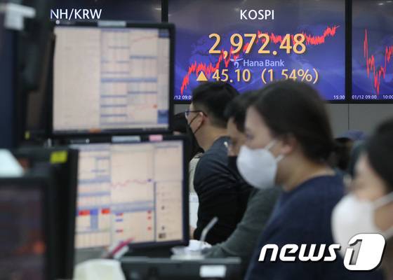 (서울=뉴스1) 이성철 기자 = 12일 서울 중구 하나은행 전광판에 코스피 지수가 전날보다 1.54%(45.10포인트) 상승한 2972.48로 마감하고 있다.