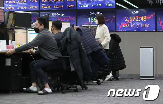 (서울=뉴스1) 이성철 기자 = 12일 서울 중구 하나은행 전광판에 코스피 지수가 전날보다 1.54%(45.10포인트) 상승한 2972.48로 마감하고 있다.