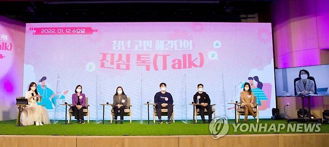 (서울=연합뉴스) 임혜숙 과학기술정보통신부 장관(오른쪽 화면)이 12일 경기스타트업캠퍼스에서 열린 '청년 고민 해결단의 진심 톡(TALK)'에서 청년들의 고민을 듣고 있다. 2022.1.12