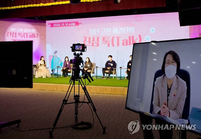 (서울=연합뉴스) 임혜숙 과학기술정보통신부 장관(오른쪽 화면)이 12일 경기스타트업캠퍼스에서 열린 '청년 고민 해결단의 진심 톡(TALK)'에서 청년들의 고민을 듣고 있다. 2022.1.12