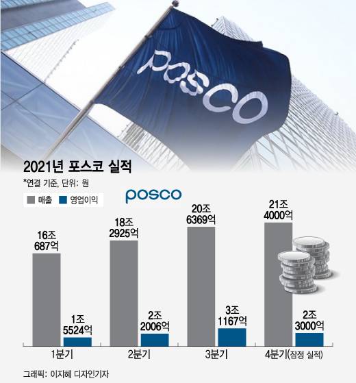 포스코가 지난해 70조원대 매출액과 9조원대 영업이익을 기록하며 창사 이래 최대 실적을 달성했다. 올해 역시 중국 동계올림픽과 대선이 끝나는 3월 이후 철강 수요가 본격적으로 늘어나며 실적 호조를 이어갈 것으로 보인다.