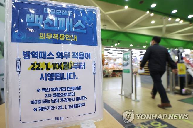 (서울=연합뉴스) 강민지 기자 = 방역패스(백신접종증명·음성확인제) 정책 집행정지 신청에 대한 법원의 결정을 앞둔 12일 서울 한 대형마트 입구에 방역패스 안내문이 놓여 있다. 2022.1.12