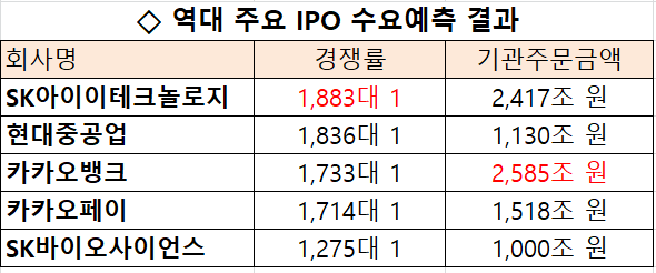 한 기관투자가는 “모든 기관들이 사실상 수요예측에 참여했다고 볼 만큼 투자 수요가 넘쳤다”며 “지난해 IPO 대어로 꼽힌 SK아이이테크놀로지·카카오뱅크의 경쟁률도 넘어설 것”이라고 분위기를 전했다.