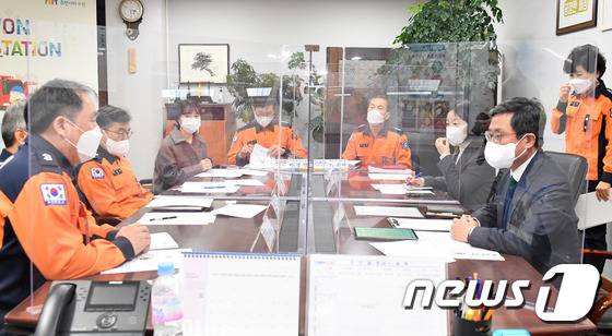 (서울=뉴스1) = 안도걸 기획재정부 차관이 12일 경기도 수원소방서를 방문, 관계자로부터 관내 현황 및 코로나19 이송현황을 듣고 있다. (기획재정부 제공) 2022.1.12/뉴스1