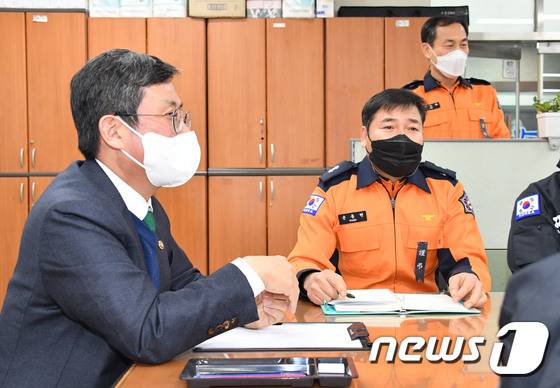 (서울=뉴스1) = 안도걸 기획재정부 차관이 12일 경기도 수원소방서를 방문, 구급대원 애로사항 청취 및 격려를 하고 있다. (기획재정부 제공) 2022.1.12/뉴스1