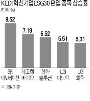 한국경제신문사의 ‘KEDI 혁신기업ESG30’ 지수는 혁신 산업을 대표하는 상장사 최고경영자(CEO) 100명과 증권·자산운용사 CEO 30명을 대상으로 한 조사를 토대로 만들어진다. CEO들이 가장 혁신적이라고 생각하는 기업 50곳을 추린 뒤 한경과 연세대 경영대학원, IBS컨설팅이 공동 개발한 ESG 평가모델을 적용해 최종적으로 30곳을 선정한다.