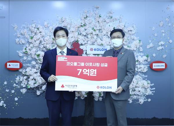 코오롱그룹이 12일 서울 중구 사랑의열매 회관에서 사회복지공동모금회 '희망2022나눔캠페인'에 성금 7억원을 전달했다. 김승일 코오롱 부사장(오른쪽)과 김상균 사회복지공동모금회 사무총장이 기념촬영하고 있다.