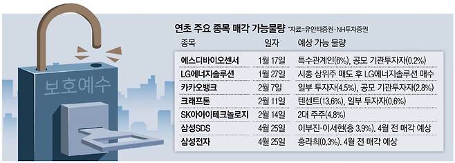 12일 금융투자 업계에 따르면 LG에너지솔루션 상장일(1월 27일)을 전후해 지난해 상장한 SK아이이테크놀로지(5월 11일), 에스디바이오센서(7월 16일), 카카오뱅크(8월 6일), 크래프톤(8월 10일)의 보호예수물량 상당 부분이 해제되는 것으로 나타났다.