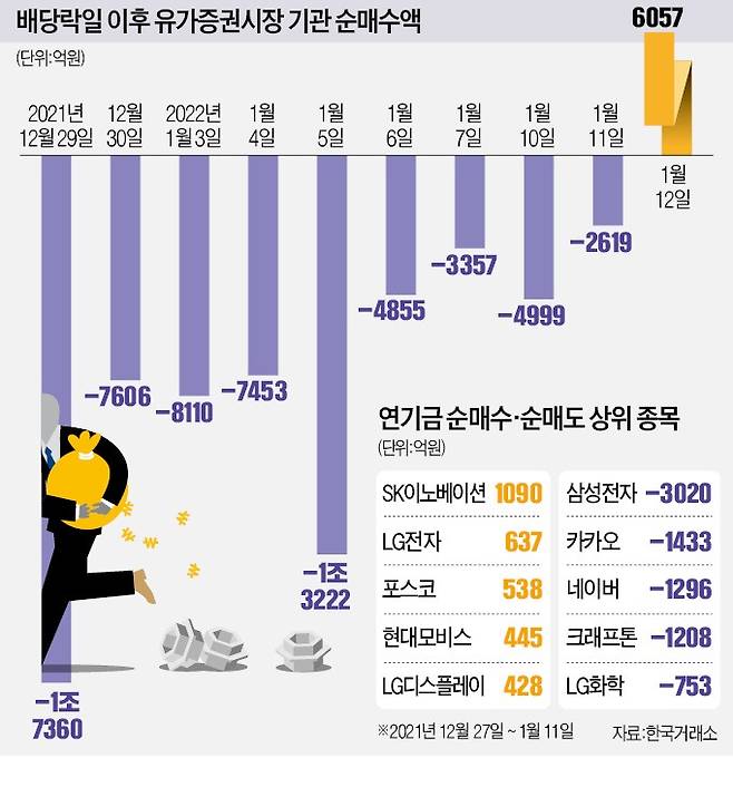 이 기간 연기금은 삼성전자(-3020억원), 카카오(-1433억원), 네이버(-1296억원), 크래프톤(-1208억원) 등을 순매도했다. 국민연금이 매년 국내 주식 비중을 줄이고 있는 만큼 삼성전자는 비중 축소에 따른 기계적 매도세로 볼 수 있다. 플랫폼이나 게임주에 대한 순매도는 금리 인상 우려를 앞두고 고(高)밸류에이션(실적 대비 주가 수준) 종목을 집중 매도한 결과로 풀이된다. 오는 27일 LG에너지솔루션 상장을 앞두고 LG화학도 753억원어치 순매도했다.