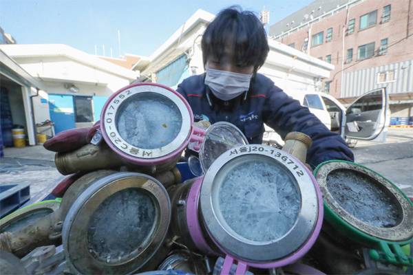 연일 한파가 이어지면서 12일 서울시는 이번 겨울 들어 처음으로 수도계량기 '동파 경계'를 발령했다. 이날 서울 종로구 중부수도사업소 효자가압장에서 한 직원이 동파된 수도계량기를 정리하고 있다.