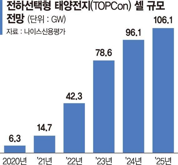 송미경 나이스신용평가 실장은 "대면적 웨이퍼를 활용하면 더 높은 전력의 출력이 가능할 뿐만 아니라 셀·모듈 제조 비용도 절감할 수 있다"면서 "셀 간 간격을 최소화해 모듈 면적당 효율과 출력을 최대로 끌어올리는 '제로갭' 기술을 활용해 더 높은 출력을 제공할 계획"이라고 설명했다.