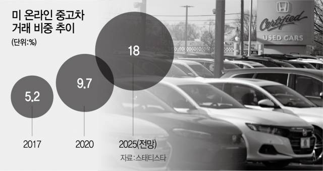 미국 내에서 중고차 거래량은 연간 4,000만 대로 신차(트럭 포함) 판매량의 2배를 넘는다. 아직은 오프라인 거래 비중이 높다. 하지만 온라인 플랫폼의 성장세는 가파르다. 지난해 글로벌 시장 조사 업체 스태티스타는 지난 2020년 9.7%에 머물렀던 온라인 중고차 거래 비중이 오는 2025년에는 약 2배인 18%가 될 것으로 전망했다.