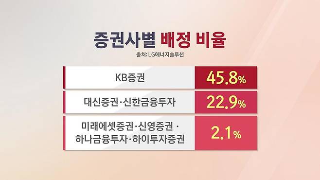 전체 물량 가운데 대표주관사인 KB증권에 45.8%, 대신증권과 신한금융투자에 22.9%, 나머지 증권사들에 2.1%씩 배정됩니다.