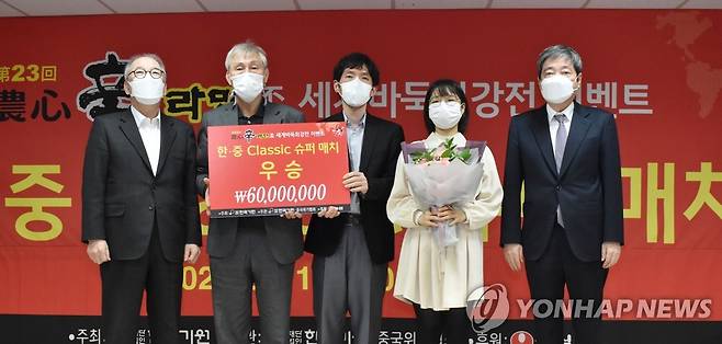 (서울=연합뉴스) 한국 바둑팀이 12일 서울 성동구 한국기원에서 중국 베이징 중국기원 간 온라인으로 열린 농심신라면배 이벤트 '한중 클래식 슈퍼 매치' 최종 3라운드 대국에서 중국에 2-1로 승리했다. 사진은 한·중 클래식 슈퍼매치에서 우승한 조훈현(왼쪽 두 번째부터)·이창호·최정 9단. 2022.1.12 [한국기원 제공. 재판매 및 DB 금지]