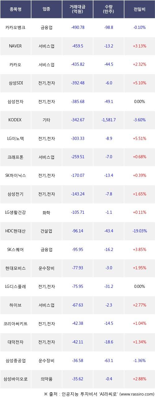 외국인 투자자의 순매도 상위 20개 종목은 카카오뱅크, NAVER, 카카오, 삼성SDI, 삼성전자, KODEX 200선물인버스2X, LG이노텍, 크래프톤, SK하이닉스, 삼성전기등이다.