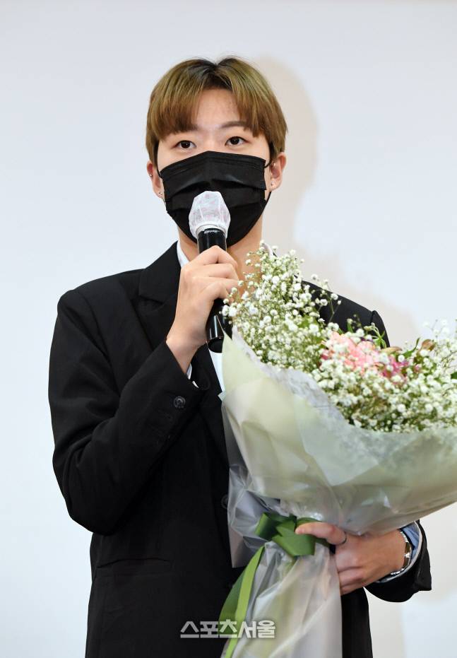 2020 도쿄올림픽 3관왕 양궁 국가대표 안산이 12일 서울 중구 코리아나호텔에서 열린 제32회 윤곡 김운용 여성체육대상 시상식에서 대상을 수상한 뒤 소감을 빍히고 있다. 2022. 1. 12.