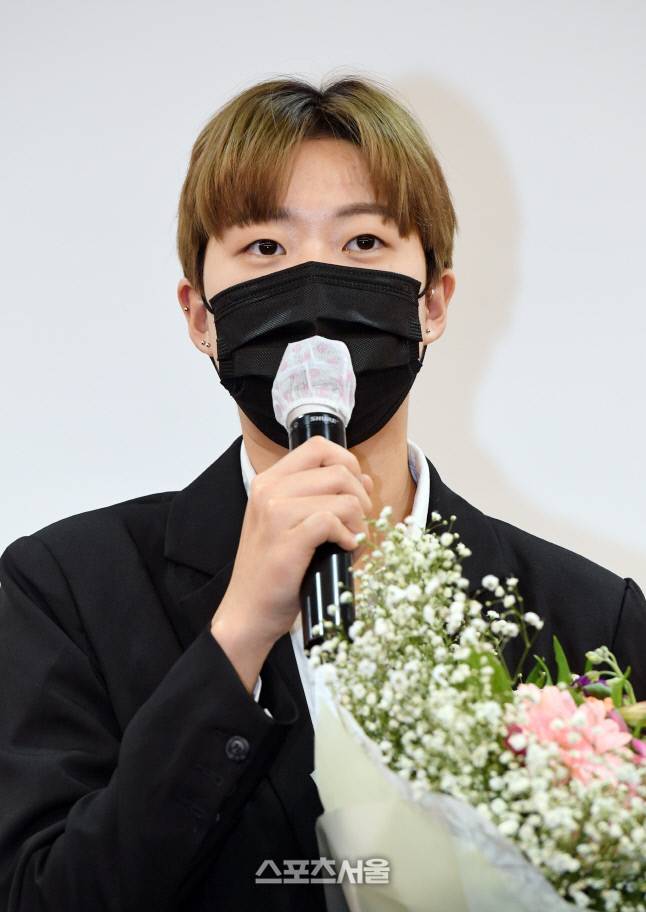 2020 도쿄올림픽 3관왕 양궁 국가대표 안산이 12일 서울 중구 코리아나호텔에서 열린 제32회 윤곡 김운용 여성체육대상 시상식에서 대상을 수상한 뒤 소감을 빍히고 있다. 안산은 31회 시상식에서는 신인상을 수상한 바 있다. 2022. 1. 12.