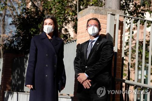 epa09680058 Queen Letizia of Spain (L) and president of the Spanish Rare Disease Foundation (FEDER), Juan Carrion (R), arrive to attend a working meeting of the Foundation in Madrid, Spain, 12 January 2022. EPA/JAVIER LIZON
