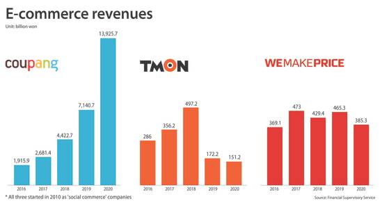 As of 2020, Coupang had 13 percent of the market compared with WeMakePrice's 4.3 percent and TMON's 3.1 percent.