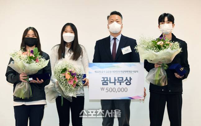 12일 서울 중구 코리아나호텔에서 열린 제32회 윤곡 김운용 여성체육대상 시상식에서 꿈나무상 수상자들이 기념촬영을 하고 있다. 왼쪽부터 다이빙 현지원, 바이애슬론 김민지, 시상자 한국중고등학교 태권도연맹 이경배 회장, 태권도 오서린. 2022. 1. 12.