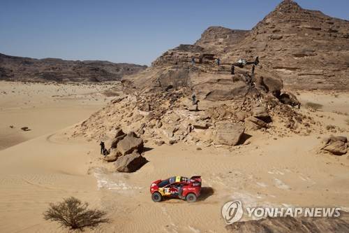 epa09680128 French driver Sebastien Loeb and Belgium copilot Fabian Lurquin of Bahrain Raid Xtreme team during the stage 10 of the Rally Dakar 2022 between Wadi Ad Dawasir and Bisha, in Saudi Arabia, 12 January 2022. EPA/YOAN VALAT