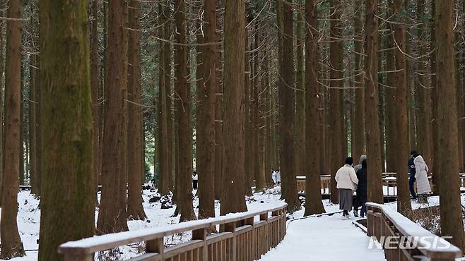 [제주=뉴시스] 이산책 기자 = 12일 오후 삼나무 숲길로 유명한 제주 사려니숲길을 찾은 관광객이 산책하고 있다. 2022.01.12. photo@newsis.com