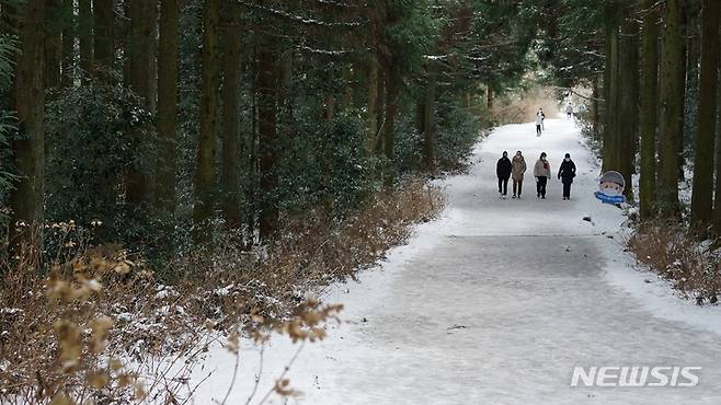 [제주=뉴시스] 이산책 기자 = 12일 오후 삼나무 숲길로 유명한 제주 사려니숲길을 찾은 관광객이 산책하고 있다. 2022.01.12. photo@newsis.com